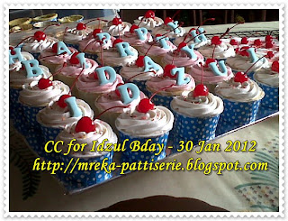 Ini salah satu order dari teman kantorku, cupcake untuk anaknya yang berulang tahun dan mau dibawa ke sekolah. Pertama nanya ke aku apa bisa bikin kue seperti yang dilihatnya di blog Fleur.....waduhhhh bakul kuenya masih amatiran soale disuruh plek sama persis belum berani....so aku tolak secara halus daripada nanti kecewa ga sesuai harapan :D